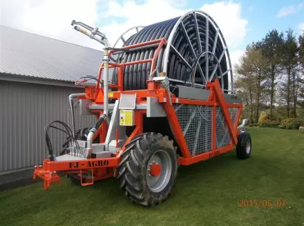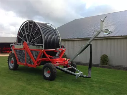 - Die erste Möglichkeit besteht in einem Aufbau, bei der die Beregnungsmaschine der Beregnungsanlage am Feldrand stehen bleibt. Der Traktor zieht nur den auf einem Wagen montierten Regner samt Leitung über das Feld zum gegenüberliegenden Feldrand. Dabei wird zugleich das auf einer Haspel befindliche Beregnungsrohr (in der Regel aus PE) abgerollt. Bei dieser Bauart können Zugrohr-Längen von rund 600 Meter realisiert werden. Die Beregnungsmaschine bleibt am Ausgangspunkt stehen. Nun wird mit einer Pumpe das Wasser zur Beregnung aus einem Brunnen oder einem Wasserreservoir gefördert und zugleich unter Druck gesetzt. Das Wasser wird dann an der Eingangsseite der Beregnungsanlage durch eine Turbine geleitet. Diese treibt die Haspel an. Dadurch wird das Zugrohr aufgewickelt und der Beregnungswagen langsam über das Feld in Richtung der Beregnungsmaschine gezogen. Hat das Wasser die Turbine passiert, wird es in das Zugrohr und schließlich den den Regner geleitet, der es gleichmäßig auf die zu beregnende Fläche verspritzt.
