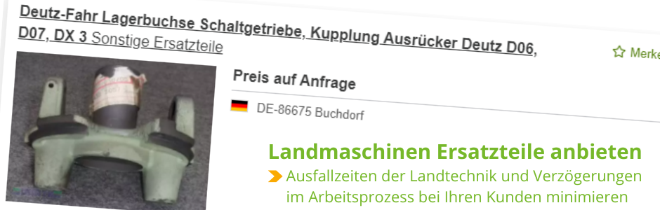 Als Händler können Sie jetzt Ihre Ersatzteile auf der technikboerse einstellen. Damit keine Arbeit bei Ihren Kunden liegen bleibt bzw. ausfällt, weil die passenden Ersatzteile fehlen, sollten Sie Ihre Landmaschinen-Ersatzteile Ihren Kunden zur Verfügung stellen. Besonders durch den Einsatz älterer Geräte ist die Nachfrage nach deren Ersatzteilen ein Dauerbrenner und der Ersatzteilmarkt immens wichtig.